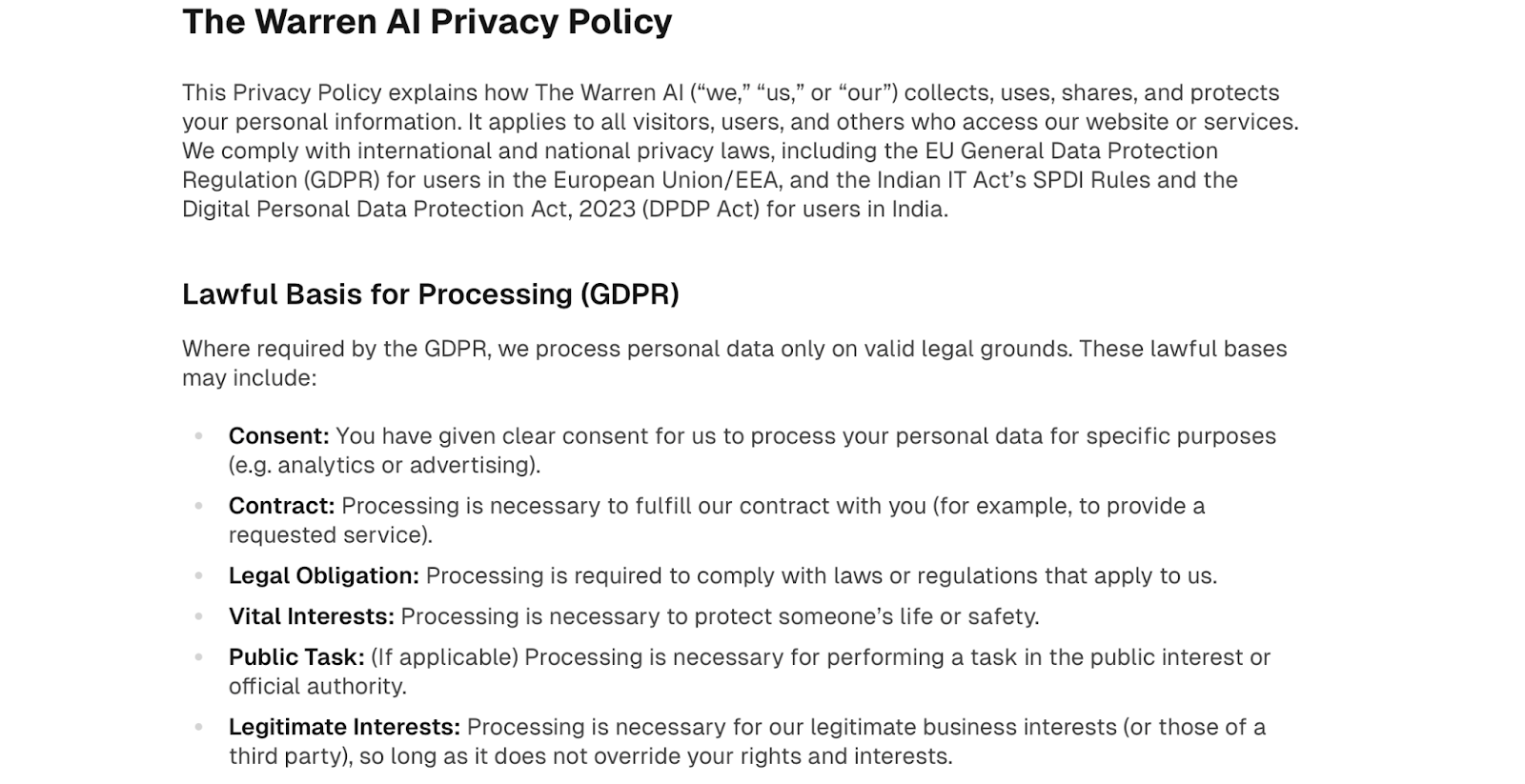 Проект упоминает соблюдение международных стандартов приватности, включая европейский GDPR и индийский DPDP Act 2023, с деталями о базах обработки данных вроде согласия или контрактных обязательств. Однако нет ясных указаний на регистрацию компании, лицензии для финансовых советов или сертификаты на ИИ.