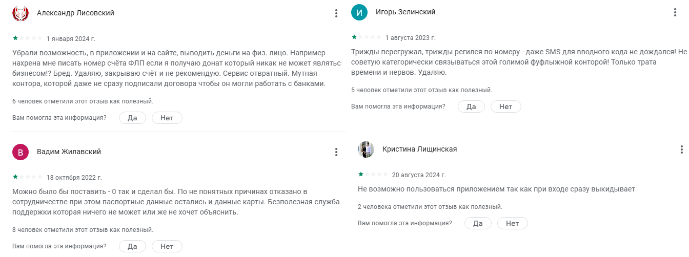 Но встречаются и негативные отклики. В них пользователи жалуются на необоснованный отказ в сотрудничестве, запрет на прямой вывод средств на счет физлиц, постоянные зависания и сбои в работе приложения.
