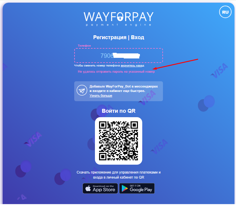 Проверка показала, что в России Wayforpay не работает. При попытке указать российский номер телефона система выдает ошибку «Не удалось отправить пароль на указанный номер».