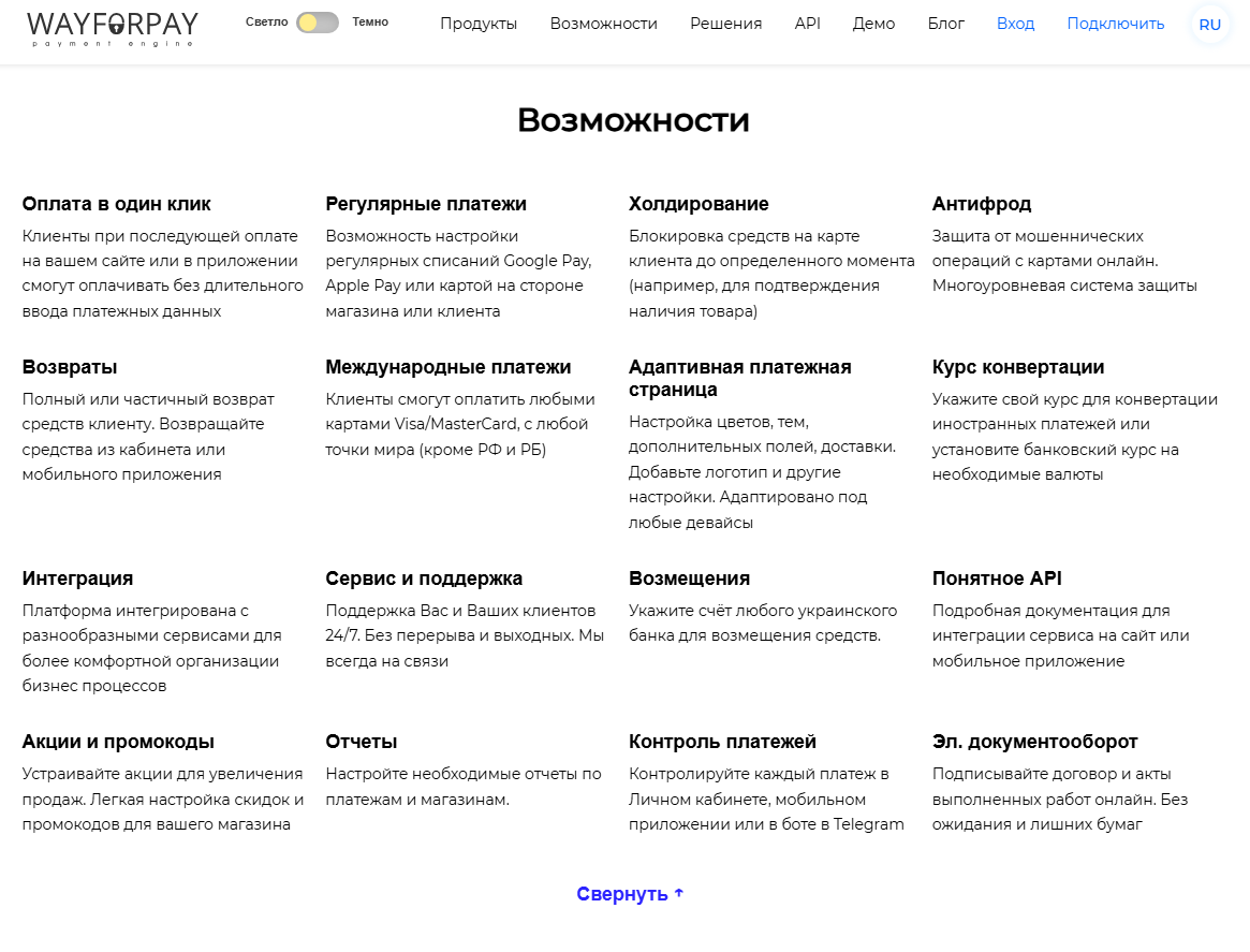 Согласно информации на сайте, платежная система Way For Pay предлагает владельцам бизнесов следующие услуги: