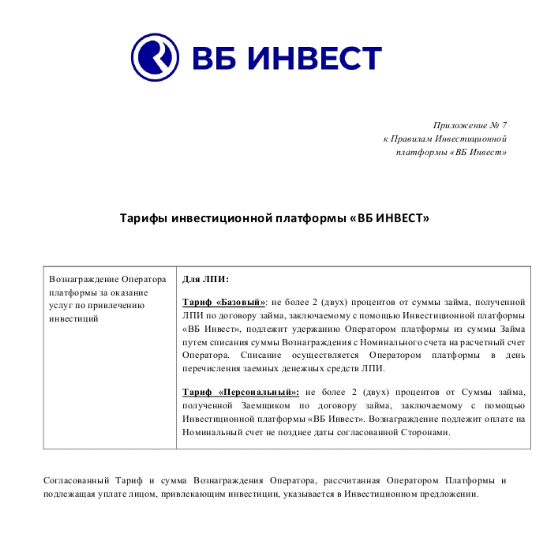 - “Базовый” — не более 2% от суммы займа, полученной ЛПИ по договору подлежит удержанию. Списание происходит в день перевода средств;