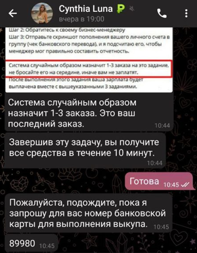 После его выполнения нужно было отписаться в чате и запросить выплату. На первый взгляд, все честно. Но по факту после первого же крупного заказа деньги, потраченные пользователем на него, никто не возвращал.