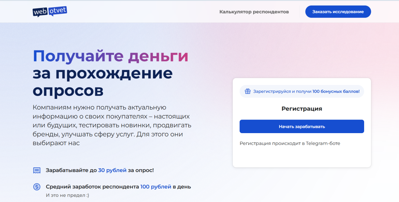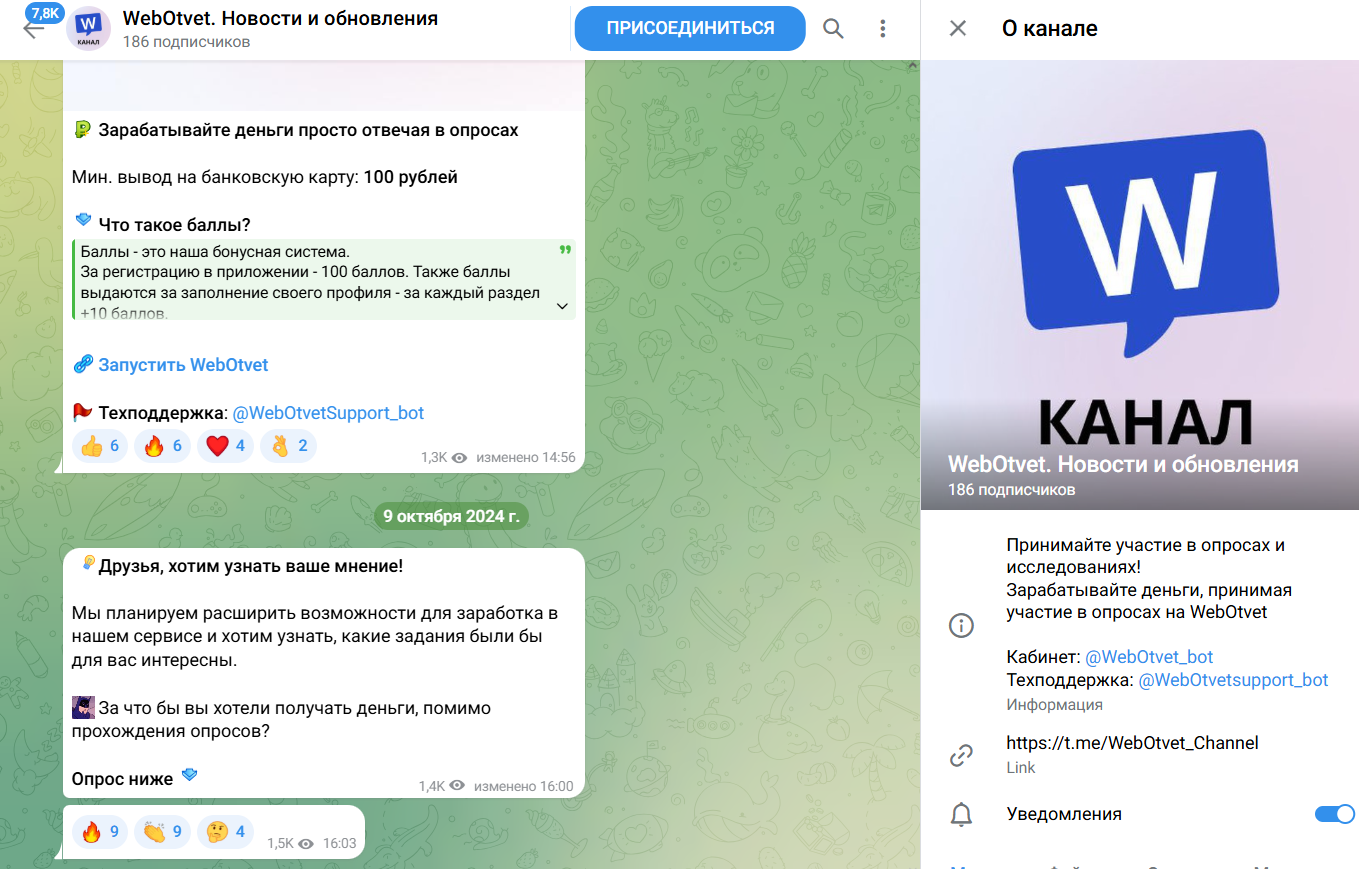 Для того чтобы создать аккаунт, пользователю нужно перейти к Телеграмм-боту проекта. Далее войти в личный кабинет через эпп, где попросят заполнить анкету. При регистрации администрация дарит 100 бонусных баллов.Webotvet предлагает просмотреть актуальные опросы, чтобы выбрать нужный и пройти. Из видов работы: рекламный опрос, продуктов, услуг и прочего. По словам основателей, средний заработок респондента около 100 рублей в сутки. Работать можно с любого мобильного устройства или же компьютера.