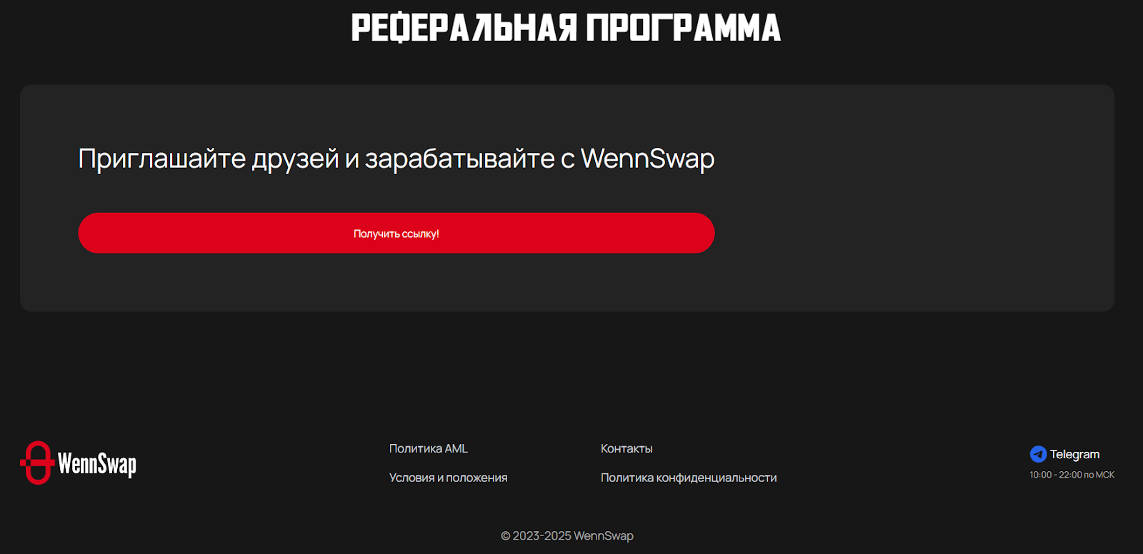 Биржа Wennswap io предлагает присоединиться к реферальной системе, для чего нужно обратиться в техническую поддержку в Телеграме. На сайте есть несколько разделов, которые объясняют политику конфиденциальности, правила обмена и прочие нюансы. Сервис может остановить перевод в любой момент, если посчитает его подозрительным. Далее потребуется проходить верификацию. Это также сомнительный момент, так как им нередко пользуются мошенники. В данном случае подобные пункты создают только больше подозрений.