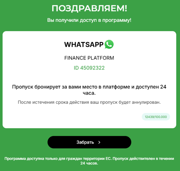 Обещано, что программа эффективна, безопасность на высоком уровне и разработчики используют AL-технологии для высокой эффективности программы. При этом, больше никаких подробностей сотрудничества нет. При попытке более детально изучить сайт, появляется оповещение, что пользователь получил доступ к программе. Причем срок пропуска ограничен и действует всего 24 часа.