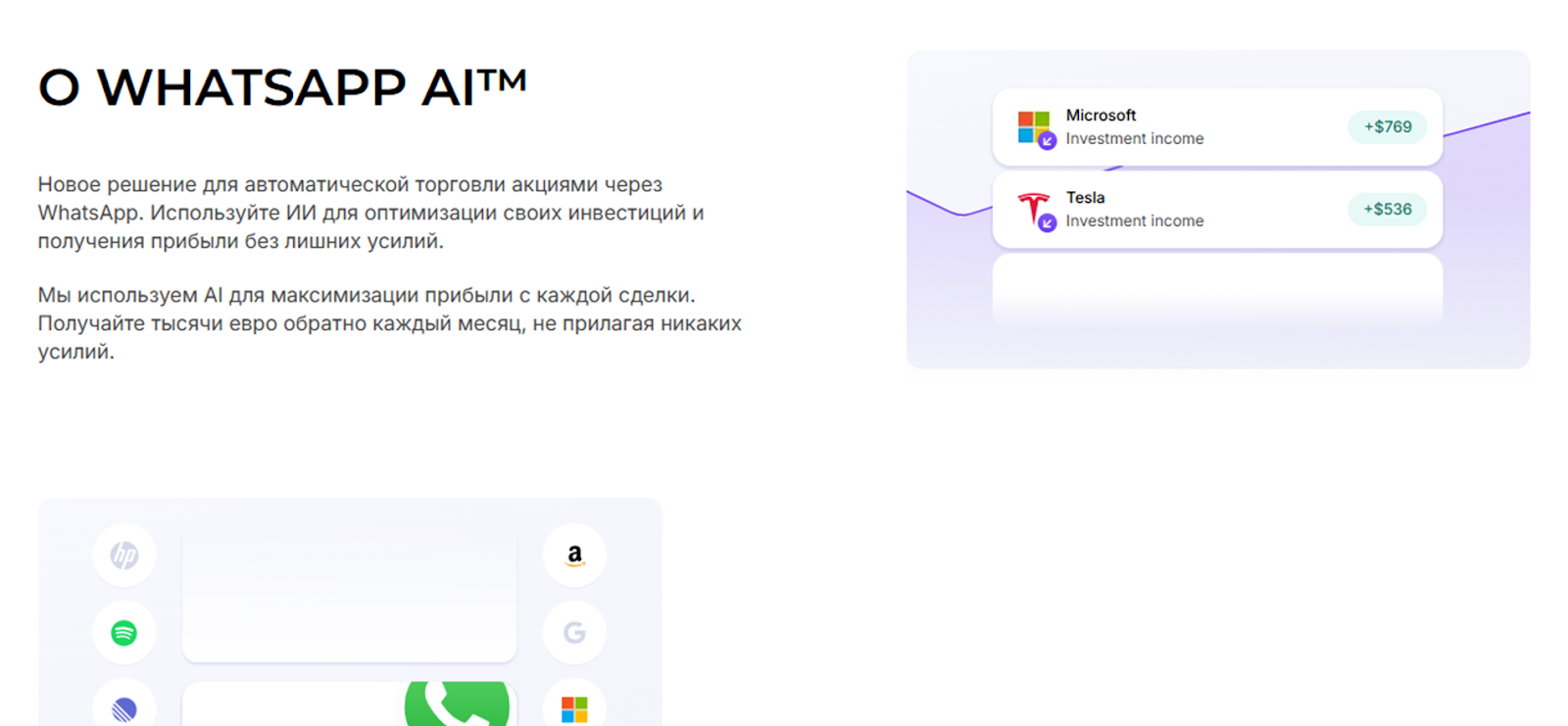 Платформа «Whatsapp ai заработок» предлагает схему быстрого обогащения через известный мессенджер для отправки сообщений. Пользователям предложена безубыточная торговля на фондовом рынке с помощью искусственного интеллекта. Стоит ли использовать сервис – рассказали в новом обзоре.