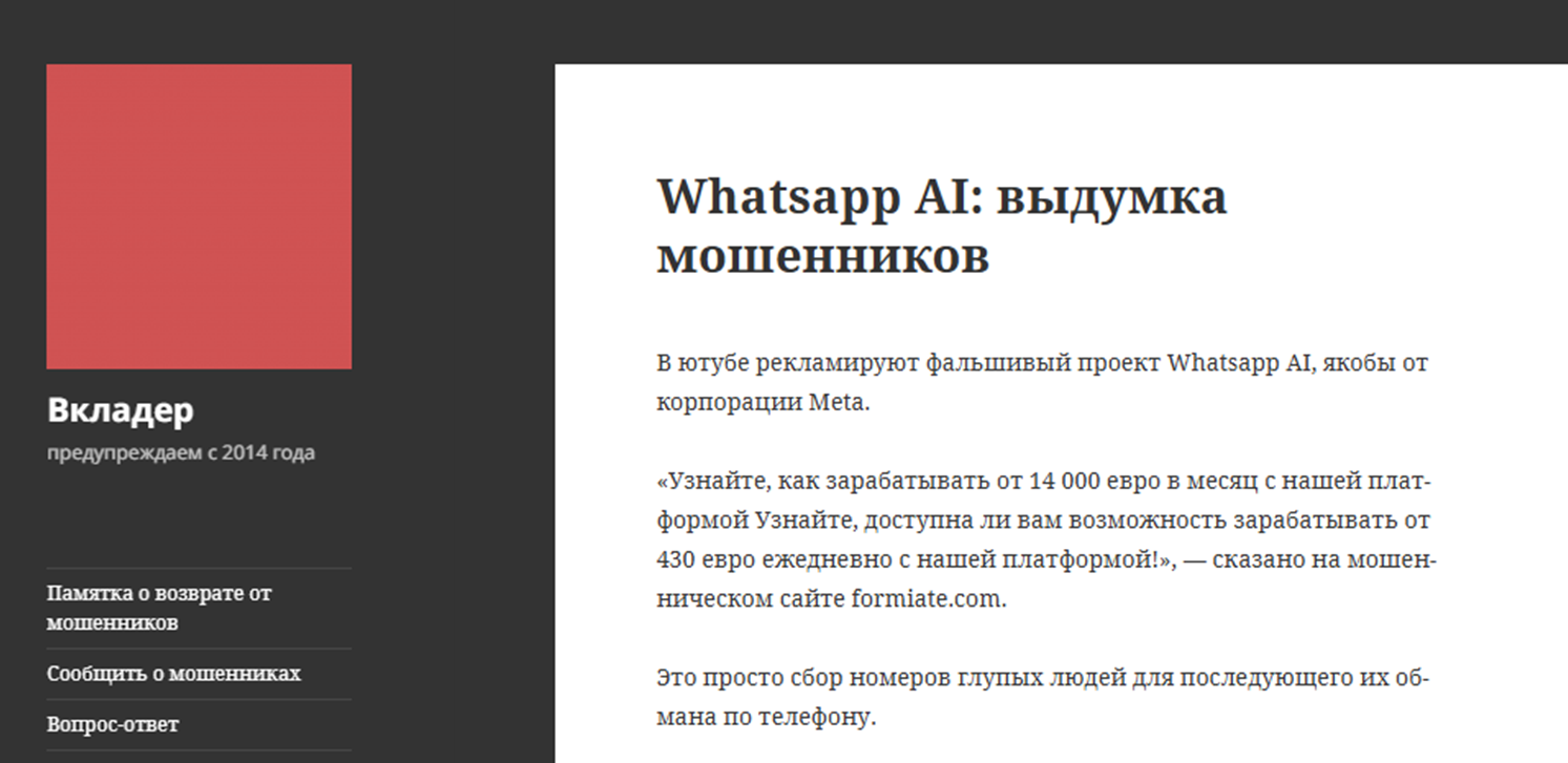 Whatsapp AI ТМ – мошенническая платформа, заработать деньги на которой не получится. Компания не имеет лицензии, не предоставляет деталей сотрудничества, существует масса идентичных сайтов-зеркал, которые регулярно блокируются. Гарантий получения прибыли нет. Репутация проекта в сети оставляет желать лучшего.