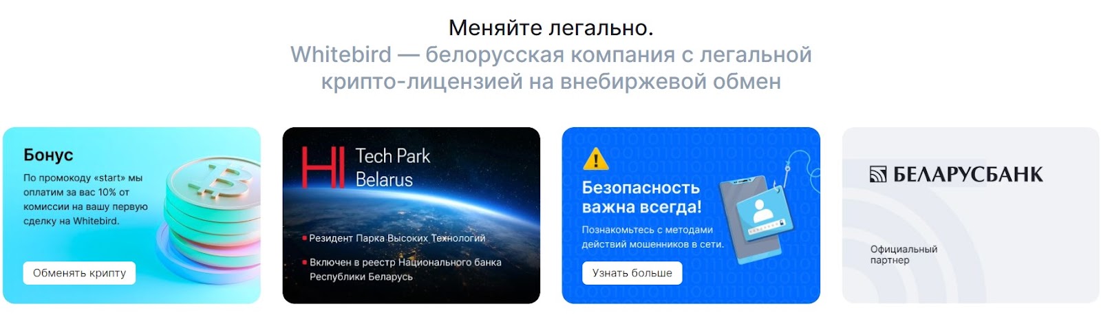 Whitebird — обменник криптовалют из Беларуси, обещает пользователям простые и выгодные обмены с использованием банковской карты. Якобы работает в полном соответствии с законами Беларуси, заявляет о 100% защите денег клиентов. Рассмотрим, как работает обменник и можно ли доверять ему свои деньги.