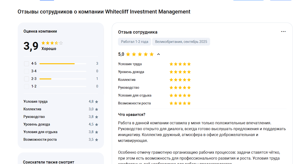 Клиентских фидбэков об этой компании практически нет. И это несмотря на заявления о глобальном присутствии и немалый стаж работы – более 10 лет. Всё, что можно найти – это отзывы сотрудников о работе в Whitecliff Investment. Но это не значит, что фирму никто не знает и с ней не работают.