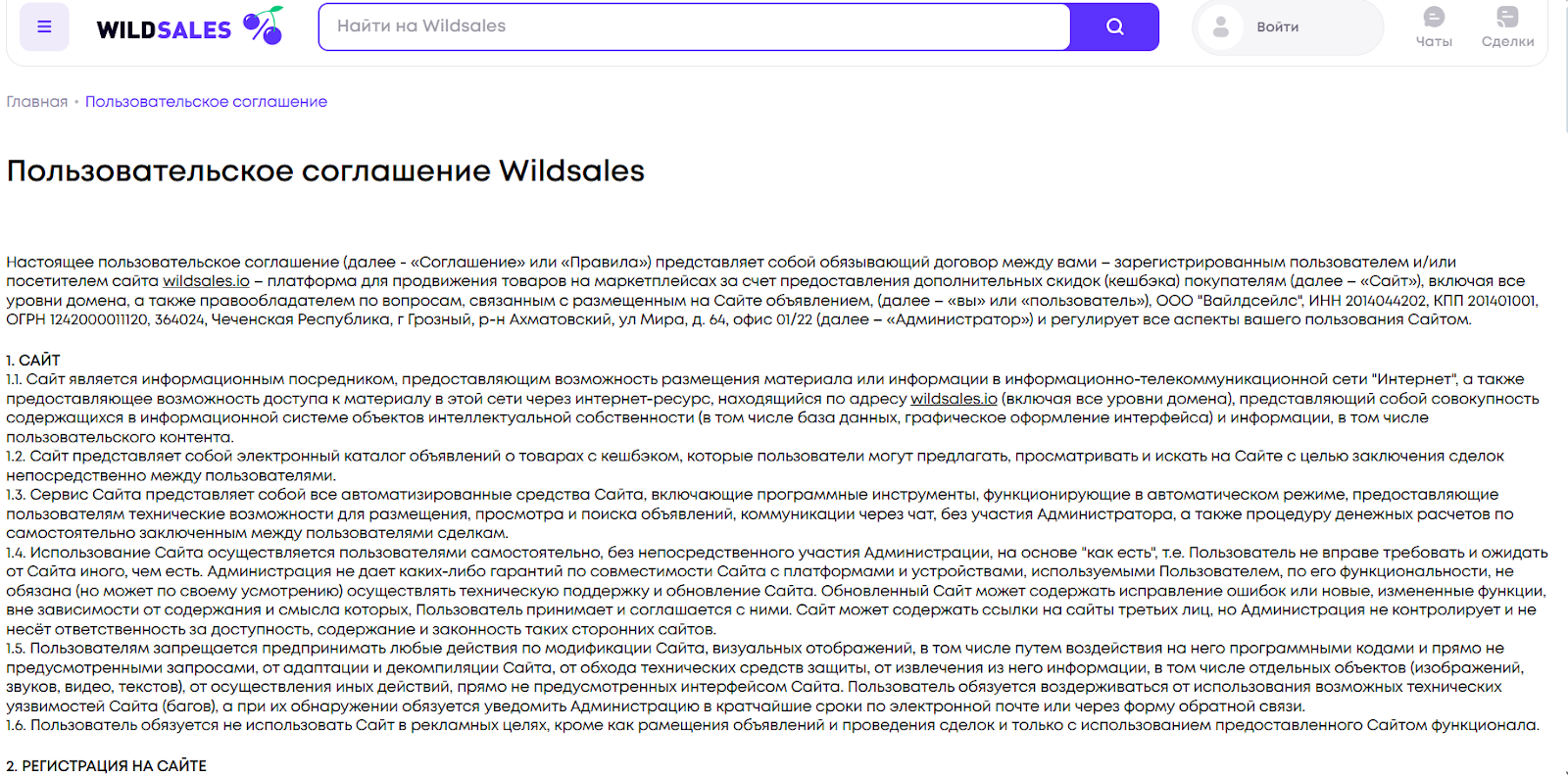 Юридически проект тоже оформлен. В пользовательском соглашении указано юрлицо ООО “Вайлдсейлс” и сервис по документам не является участником сделок. Он не продает товары, не покупает их и не отвечает за итог — он лишь дает площадку, инструменты и технический механизм, через который продавец и покупатель взаимодействуют напрямую.