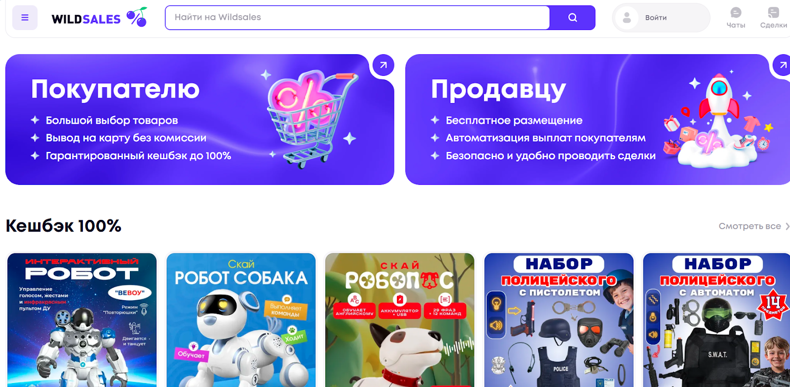 Wildsales — это онлайн-платформа для продвижения товаров на Wildberries через кэшбэк покупателям, где продавцы размещают товары с дополнительной скидкой или компенсацией стоимости, а покупатели получают деньги обратно после выполнения условий сделки и оставления отзыва.