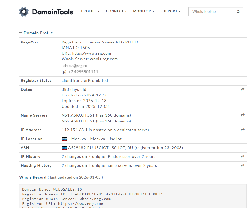 Проект работает через домен, который зарегистрирован 18 декабря 2024 г. На момент проверки 5 января 2026 г. домену чуть больше года, что в целом совпадает с датами активности платформы и запуском тг каналов весной 2025 г.