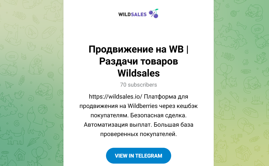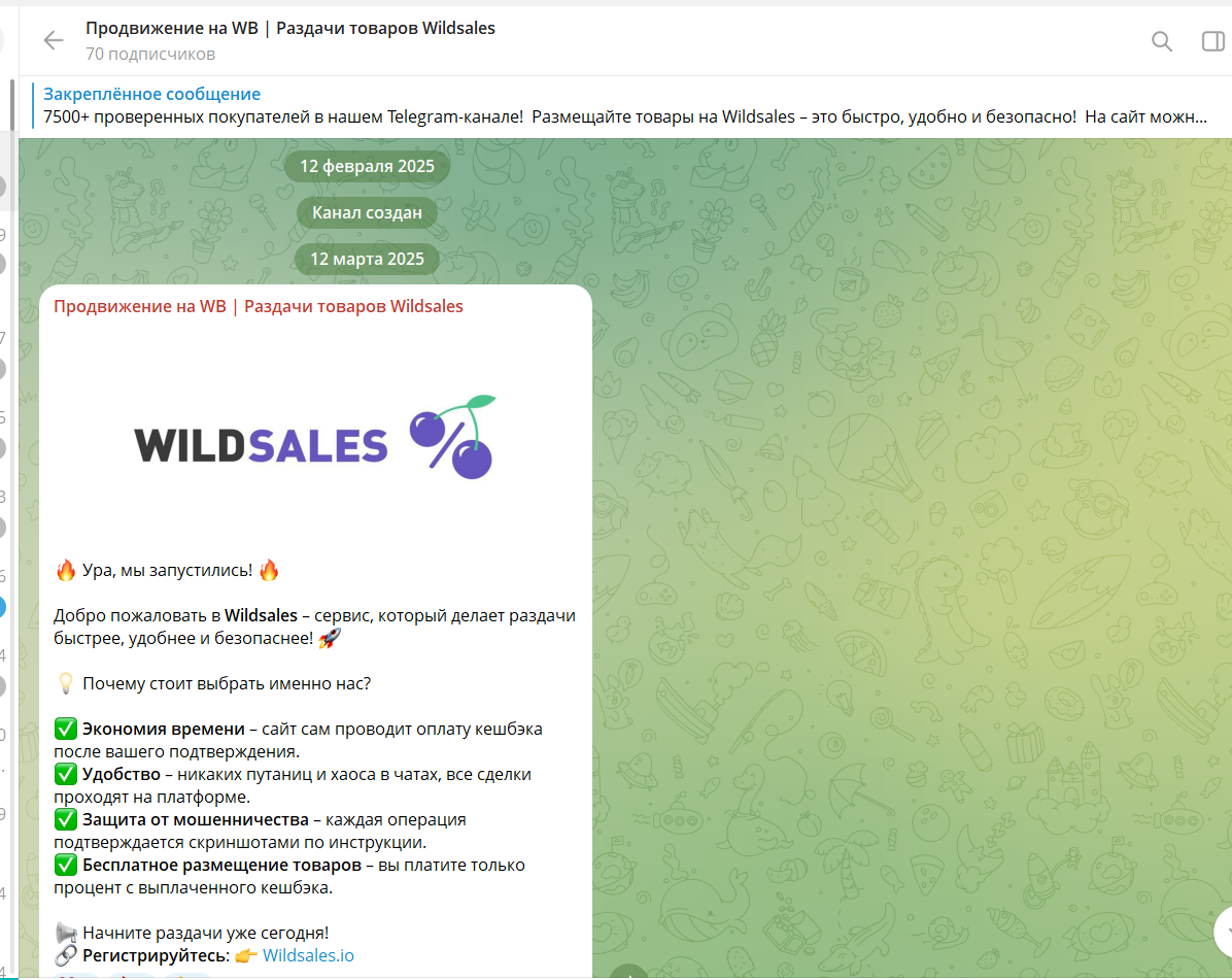 У проекта несколько тг каналов. Есть канал для продавцов @wildsaleshop с 70 подписчиками, где публикуются обновления платформы, инструкции, изменения логики сделок и отчеты о развитии сервиса.