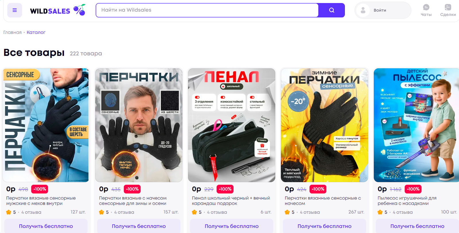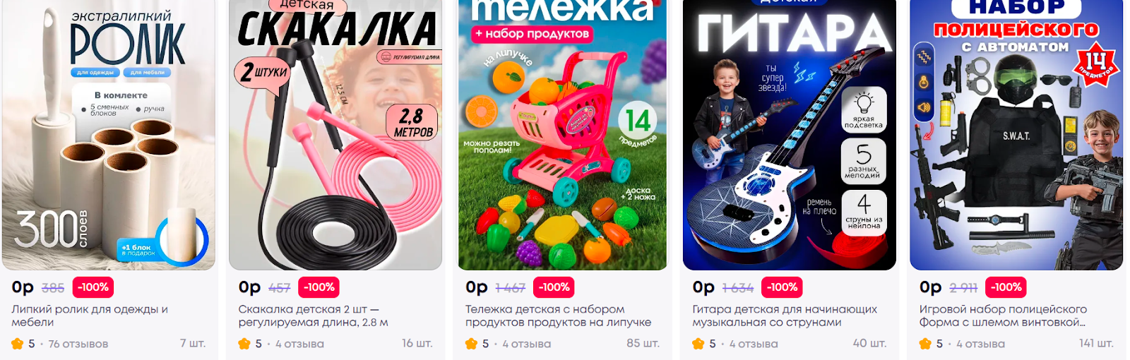 Каталог насыщенный: на сайте десятки и сотни товаров, многие из них детские игрушки, бытовые мелочи, аксессуары, техника, одежда. Часто у товаров указано по 4–5 отзывов с рейтингом 5.0, причем такая картина повторяется практически у всех бесплатных позиций.