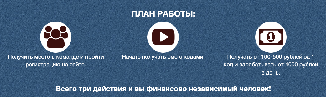 Участникам проекта обещают доход от 4 тысяч рублей в день. Для этого нужно принимать в СМС коды и отправлять их Анне. Каждая переданная комбинация символов приносит 100-500 рублей.