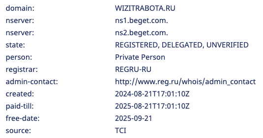 Чтобы выяснить, когда сайт wizitrabota ru заработал, мы запросили данные его доменного имени из сервиса Whois. Выяснили, что оно было зарегистрировано 21 августа 2024-го года.