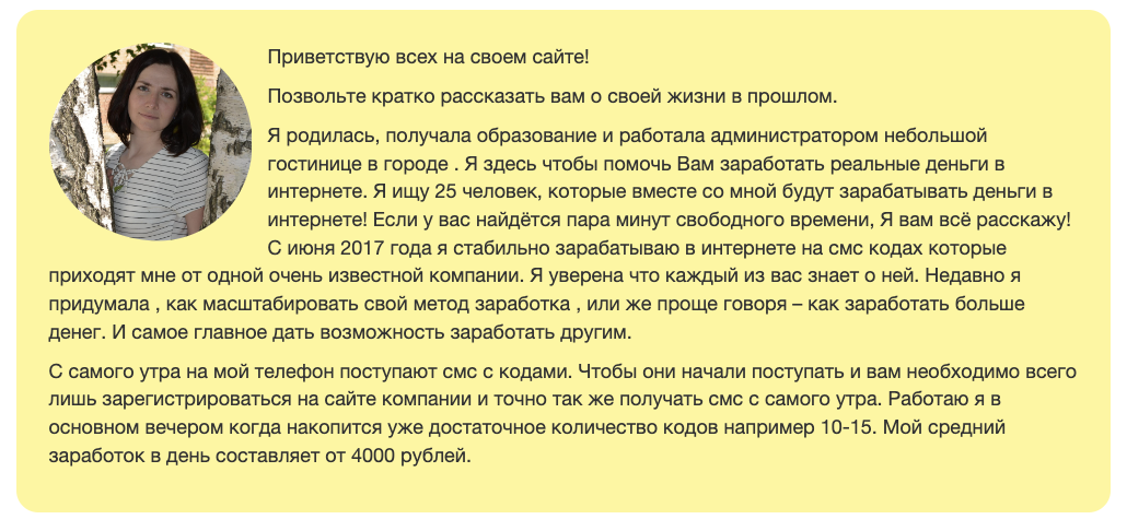 «Визит Работа» – сайт, на котором некая Анна Сергеевна предлагает, как она утверждает, доступный каждому способ заработка. Чтобы получать деньги, требуется принимать коды СМС на мобильный телефон.