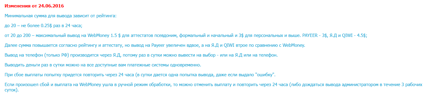 • для Payeer, ЮМани, QIWI, банковских карт и мобильных операторов — порог выше, от 0.20$ до 1$;