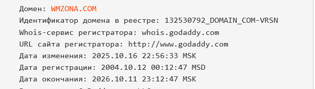 - оплата домена wmzona com произведена до октября 2026 года.