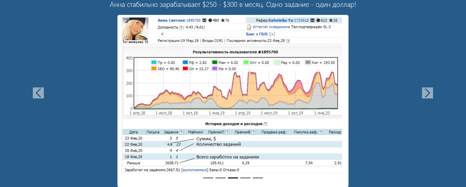 На сайте указано, что сразу же после создания учетной записи на «ВмЗона», пользователь начинает получать задания, на выполнение которых уходит от одной до пяти минут.Также на странице проекта в интернете есть статистика по заработкам исполнителей. Например, Анна стабильно зарабатывает от $250 до $300 в месяц.