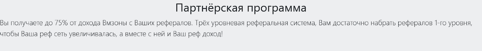Также у проекта есть реферальная программа: пользователь получает до 75% от дохода «Вм Зона», который приносит компании каждый приглашенный и зарегистрированный друг.