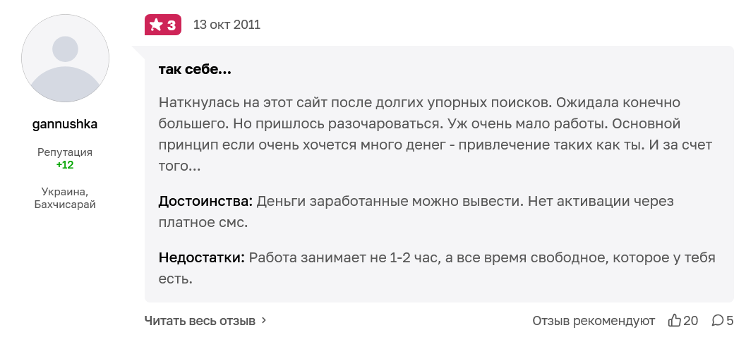 На платформе не публикуются отклики исполнителей, а на тематических сайтах можно встретить только негативные жалобы о «ВмЗона». Однако, удалось найти только фидбэки 2011 года, «свежих» в интернете нет. Люди писали, что заданий очень мало, платили копейки, хотя с выплатами не обманывали.