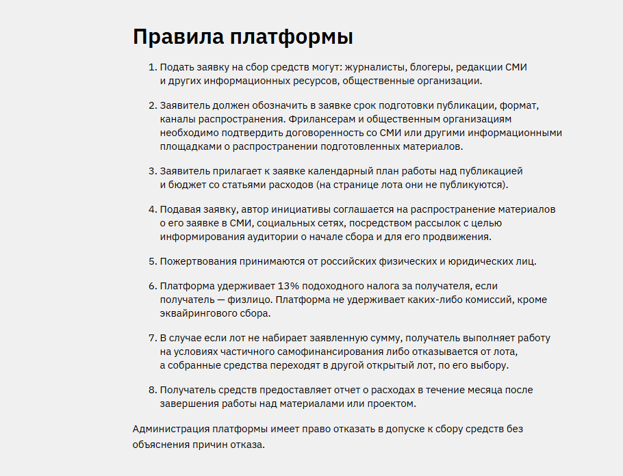 Администрация может отказать без объяснений. Жертвуют только граждане и компании из России. С физлиц удерживают 13% НДФЛ. Других комиссий нет, кроме банковского сбора.