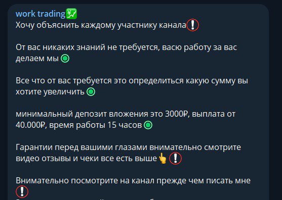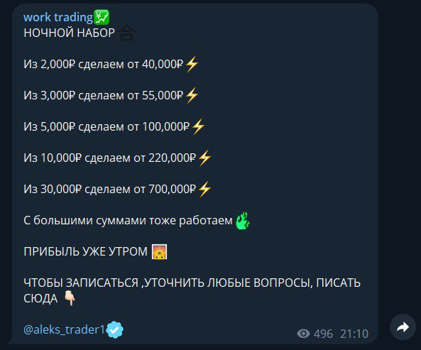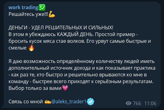 В реальности Work Trading нигде не торгует, а запустили канал только чтобы выманивать депозиты и последующие переводы. Если жертва откажется платить, ее забанят, а общение прекратится.