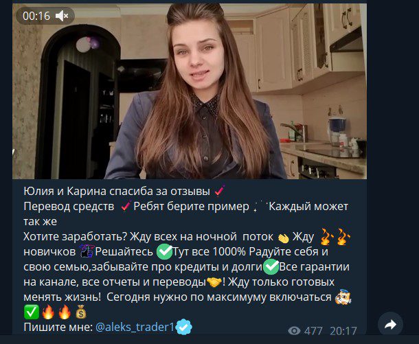 Контент канала сводится к призывам передавать Алексу депозиты на раскрутку. Выкладывает мотивационные тексты и отзывы: Телеграмм Ворк Трейдинг публикует их в формате роликов. Есть и привычные для скамеров фотографии с пачками купюр, которые должны показать огромные доходы Алекса.