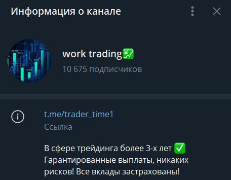 Трейдер Work Trading — Телеграм-канал с раскруткой депозита. Раздает стандартные обещания громадной прибыльности и полной защиты денег. Разберемся, почему от этого канала и его автора лучше держаться подальше.