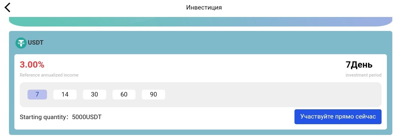 Минимальная сумма пополнения составляет 50 долларов, но для инвестиций в USDT требуется 5000 долларов, что довольно много. Их можно вложить на 7, 14, 30, 60 и 90 дней. От срока зависит процент прибыли и он составляет максимум 15%.