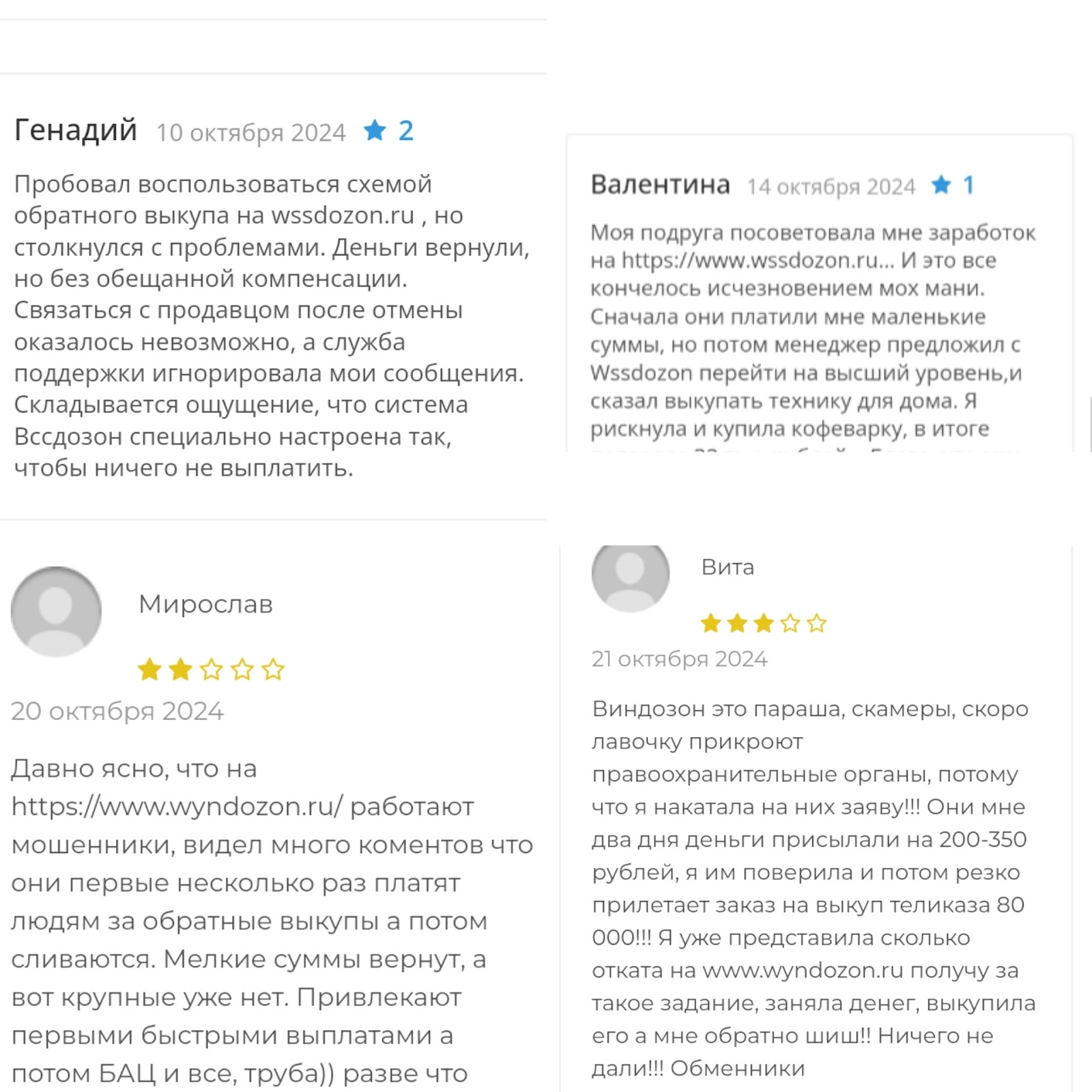 На сторонних платформах мы нашли отзывы о том, что Wyndozon ru принадлежит мошенникам. Сначала клиентам платят небольшие суммы. Однако потом попадаются дорогие товары, и даже после их оплаты зарплата не приходит.