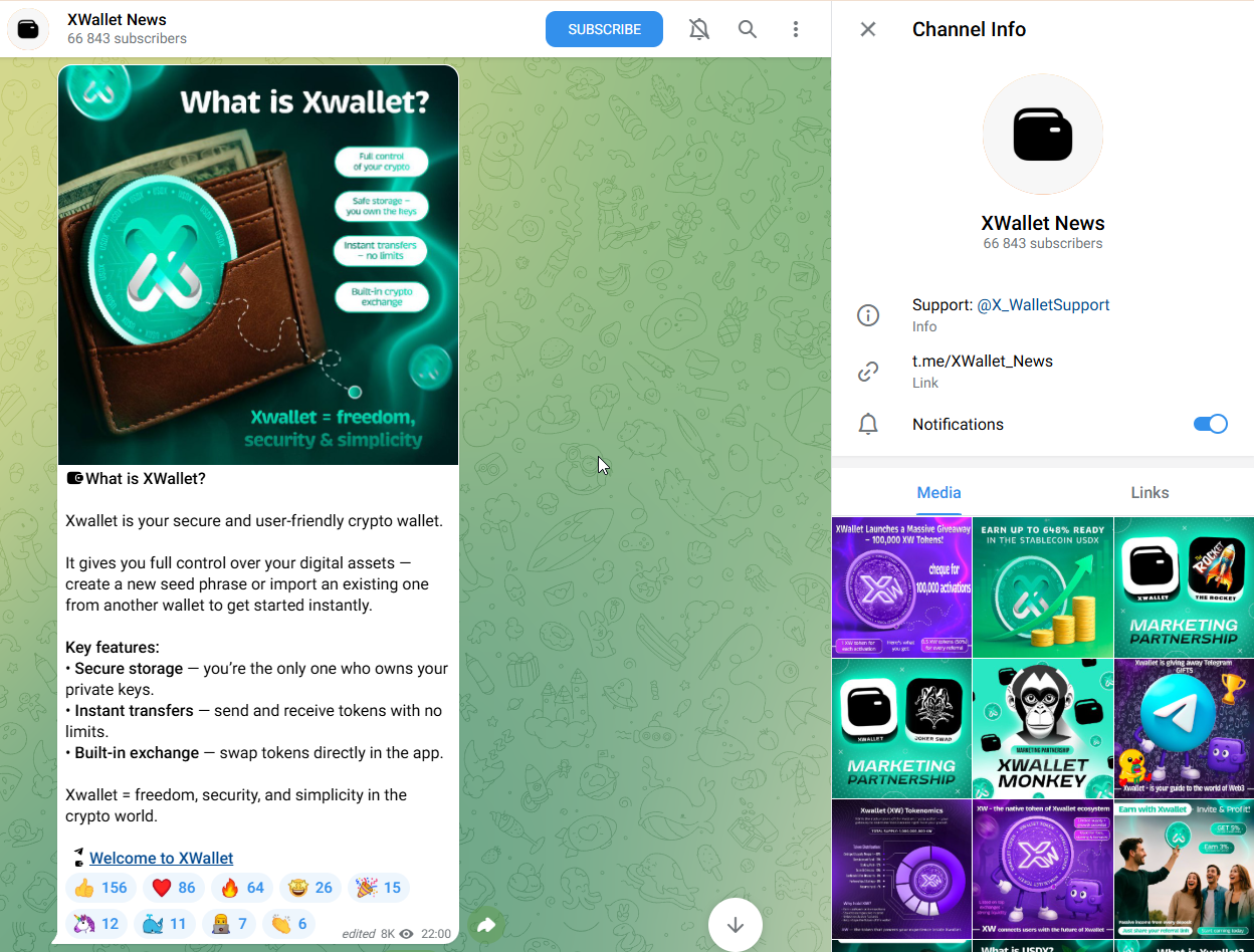 Кошелек имеет аккаунты в двух социальных сетях: Телеграм и Х. В Телеграме есть канал под названием XWallet News. Существует он меньше месяца, однако за это время в нем уже собралось 66 тысяч подписчиков. При этом аудитория довольно активная, посты просматривает по 40 тысяч пользователей, которые оставляют реакции и комментарии. На накрутку это не похоже. Основной контент в канале – это анонс новых партнеров кошелька, а также прочих важных событий.