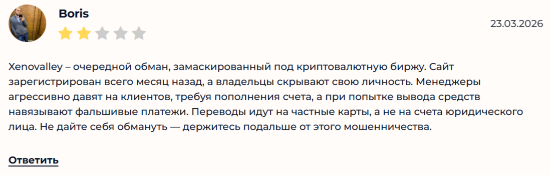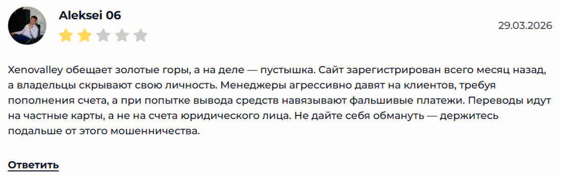 Отрицательные отзывы о Xenovalley подтверждают, что деятельность биржи мошенническая. Пользователям обещают простой и быстрый заработок, но на самом деле все это обман. Администрация сервиса применяет в работе агрессивный маркетинг, требуя с клиентов зачислять депозиты снова и снова. В итоге пользователи лишаются своих денег, а заработать там ничего не могут. Положительных отзывов о представленной бирже нет.