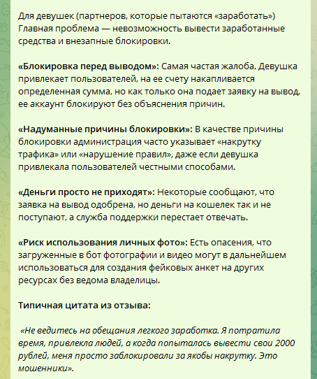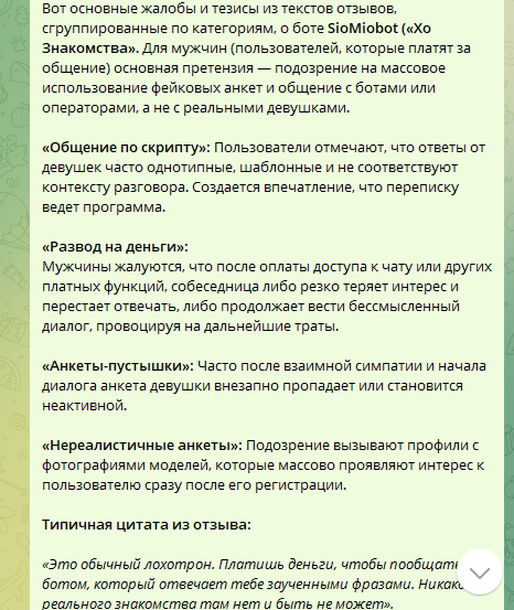 Таким образом, вы не найдете сейчас реальные истории людей, которые столкнулись с проблемами при использовании бота Siomiobot. Причем как со стороны тех, кто пытался познакомиться, так и со стороны тех, кто пробовал на нем «заработать». Все они “зачищены” в сети. Но нам удалось узнать из скрытых архивов, что основные претензии сводятся к невозможности вывести деньги, фейковым анкетам и обману.