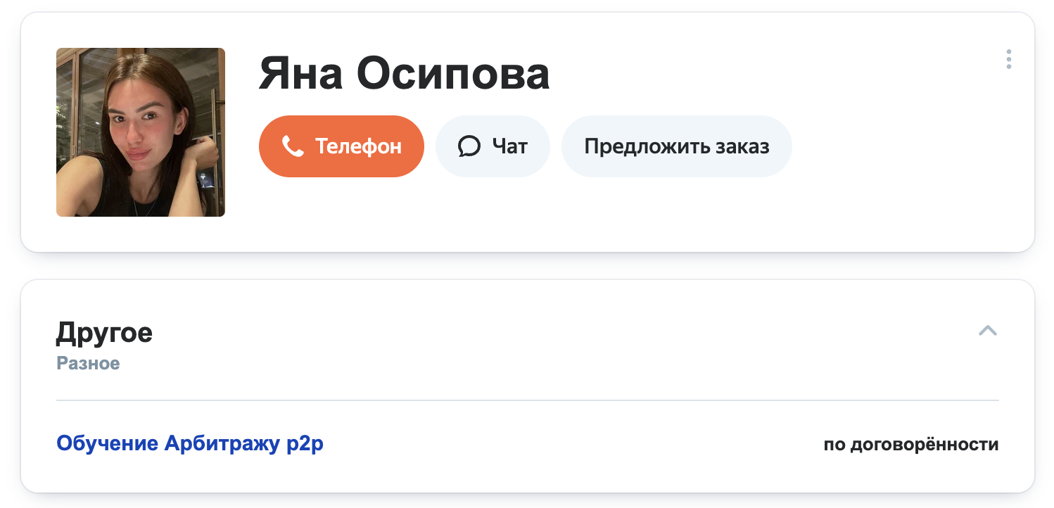 Профиль отмечен как «Паспорт проверен» — это формальный плюс для площадки и для первых этапов доверия. Однако отсутствие открытых кейсов и минимальное количество независимых упоминаний на сторонних площадках усложняют верификацию профессионального бэкграунда. По результатам быстрого поиска публичных упоминаний Yana Osipova как преподавателя P2P — встречаются разные однофамильцы и профили, но связных с обучением арбитражу материалов немного, что уменьшает следы деятельности в рунете. Верификация паспорта подтверждает лишь личность в рамках сервиса, но не гарантирует компетенции в специфической нише P2P-арбитража.Как устроена схема продажи услуг