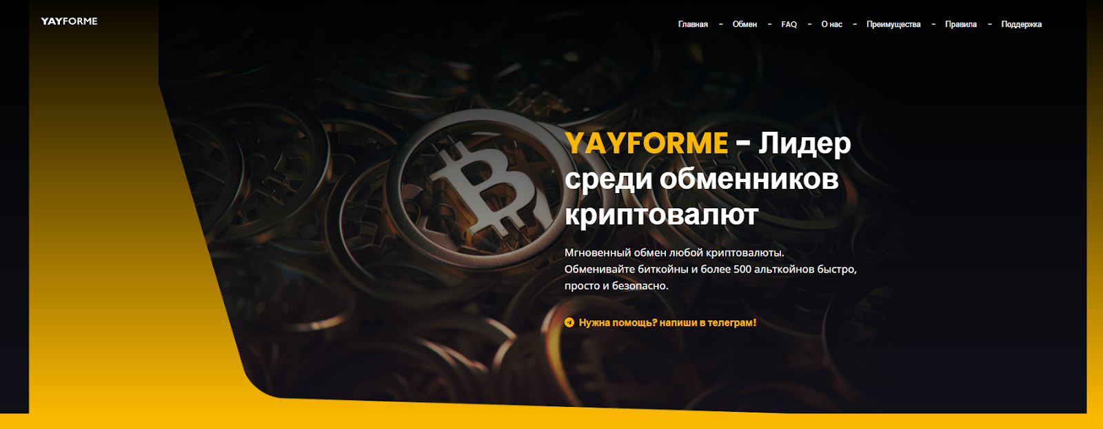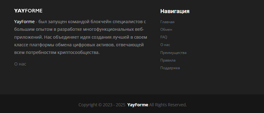 YayForme com – это обменник для криптовалюты, заявляющий о своем лидерстве на рынке. На сайте компании указано, что она больше 10 лет в индустрии и гарантирует безопасность операций.