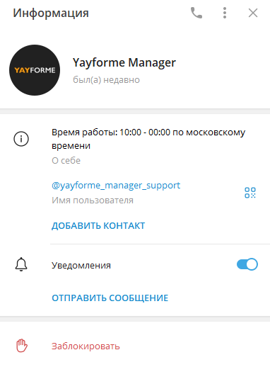 Yayforme Manager работает каждый день, с 10:00 до 00:00 по московскому времени.