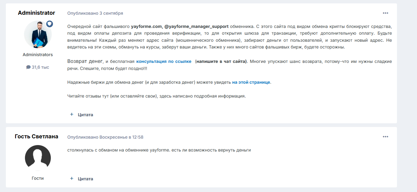 В интернете мало отзывов об обменнике YayForme com, что наталкивает на подозрения. Вероятно, у проекта мало клиентов, поэтому он не обсуждается на форумах. Удалось найти только несколько отзывов, в которых компанию считают мошеннической.