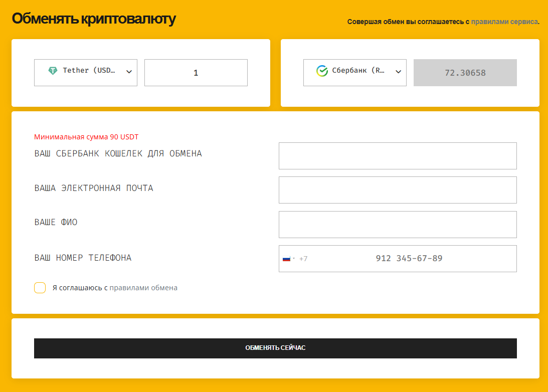Разберем обмен на примере пары USDT в рубли, переводом на карту «Сбербанка». Сервис YayForme устанавливает ограничение в 90 монет. За 1 USDT предлагают перевести ₽72.3, что значительно ниже рынка в сентябре 2025 года.