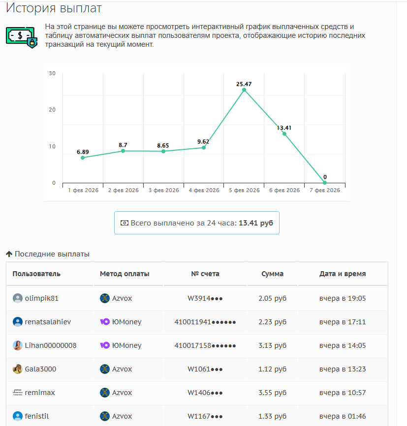 На сайте доступна статистика выплат, но и она не выглядит серьезной. Так, например, при написании обзора за последние сутки все пользователи платформы в общей сложности получили чуть более 13 рублей, а 1 февраля – почти 7 рублей. Подобные предложения с большой натяжкой можно назвать заработком.