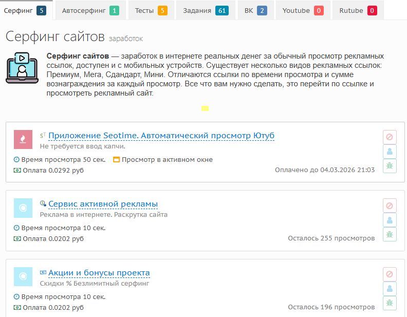 Доступные задания оплачиваются не очень высоко. Так, например, за серфинг сайтов предлагается около 2 копеек.