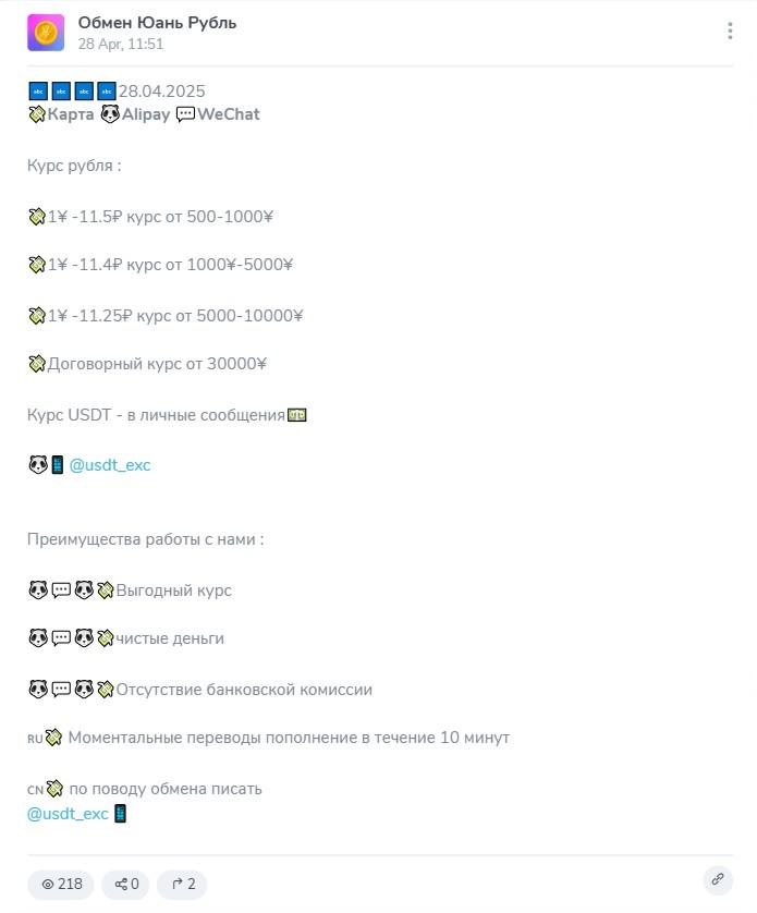 Телеграм-канал «Обмен Юань Рубль» (ник yuan exc) создан в 2023 году. На него сейчас подписано 1 604 человека. Из них примерно 45% интересуются постами, которые представлены исключительно актуальными обменными курсами. Другой информации в этой группе нет. Создал ее некий Владимир, который и принимает заявки на обмен валют. Для этого ему необходимо написать в личные сообщения в ТГ – usdt exc в Telegram.