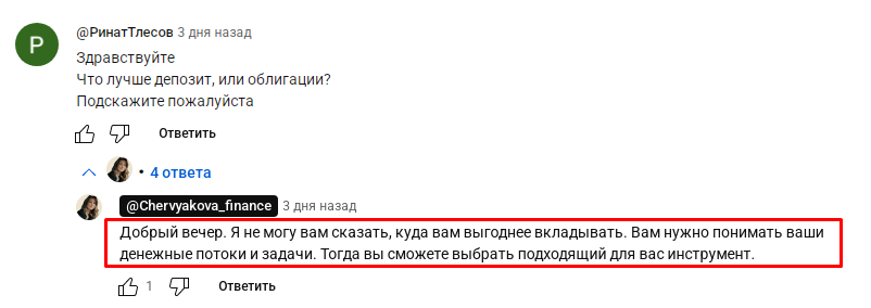 А в этом комментарии подписчик по имени Ринат задал Червяковой вопрос: что лучше — депозит или облигации, и Юлия не смогла на него ответить, что свидетельствует о ее низком уровне квалификации.