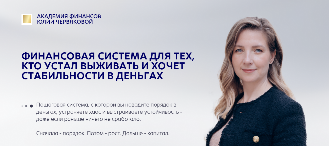 У Юлии Червяковой есть сайт Academyfinance.Online через который она продает свои инфопродукты. Обещания коуча стандартные, такими обычно пользуются инфоцыгане: