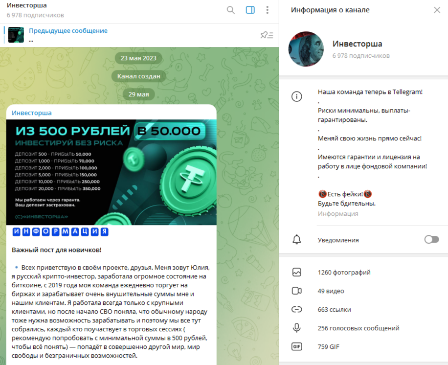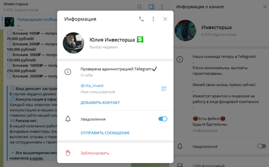 Она никак себя не афиширует, не выкладывает голосовые или фотографии. Скорее всего это вымышленный образ, а за кадром находится аферист. На независимых источниках о телеграмм-канале Юлий Инвесторше (Юлии Инвест) тоже нет упоминания и отзывов. Такая анонимность очень сильно подрывает доверие к проекту.