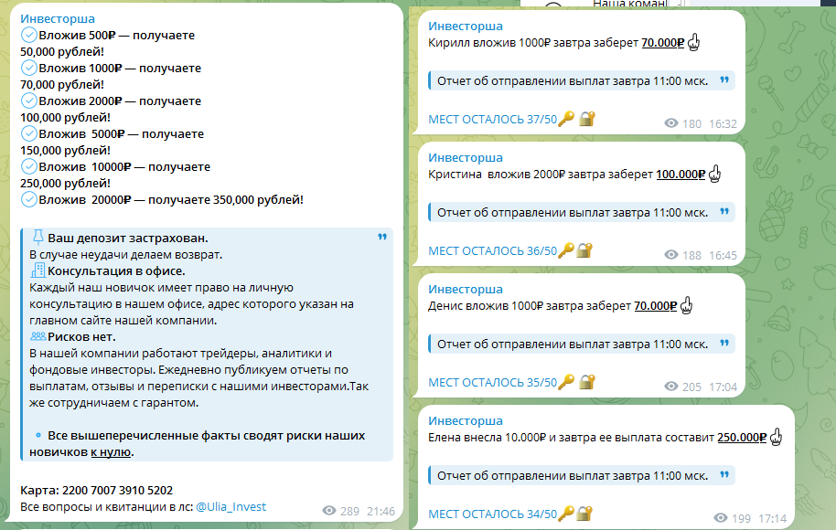 Работая в тг почти полгода года у скам-канала Инвесторши условия и цены не изменились. Так, они предлагают вносить депозит от 500 рублей и до 20 000 тысяч. Якобы минимальный взнос принесет клиенту 50 тысяч рублей, а максимальный — 350 тысяч рублей. Также инвестор заявляет, что все депозиты застрахованы и если сделка окажется неудачной, она обязательно сделает возврат денежных средств. Для получения своей выплаты нужно подождать около 15-21 часов.