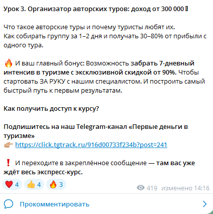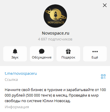 В Телеграме у Юли имеются канал и бот для взаимодействия с эдюкейшн площадкой.В ленте сообщества размещена информация об этапах обучения. Yuliya обещает пользователям, что они смогут выводить прибыль размером 30% — 80% от стоимости проданного тура. Величина скидки на прохождение обучение иногда достигает 90%. Также на канале Юлия Новосад регулярно публикует отзывы довольных студентов о курсе по туризму.