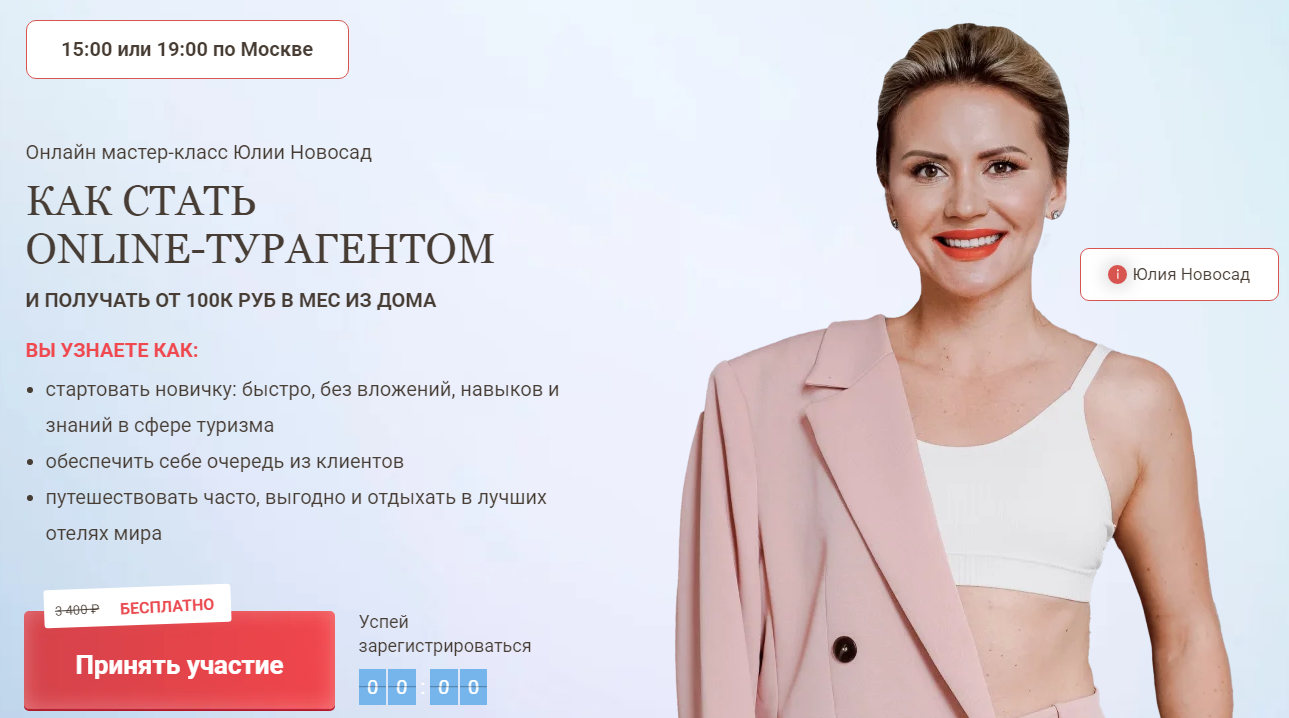 Опытный наставник Юля помогает юзерам с нуля построить бизнес в туристической сфере. Работать, согласно утверждениям успешного куратора можно из дома. Это профессиональное направление идеально подходит для девушек, находящихся в декрете, поскольку сама Yuliya, согласно ее заявлениям, начинала развиваться в тур-направленности именно в этот период.