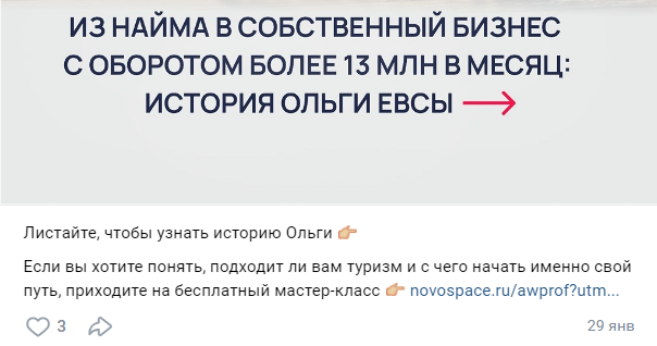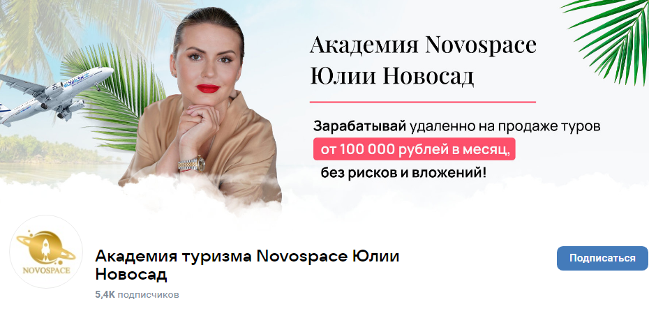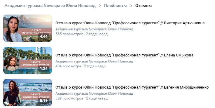 В группе «Академия туризма Novospace Юлии Новосад» размещены положительные отзывы о проекте. В паблике выложены фидбеки довольных выпускников школы в видео формате.